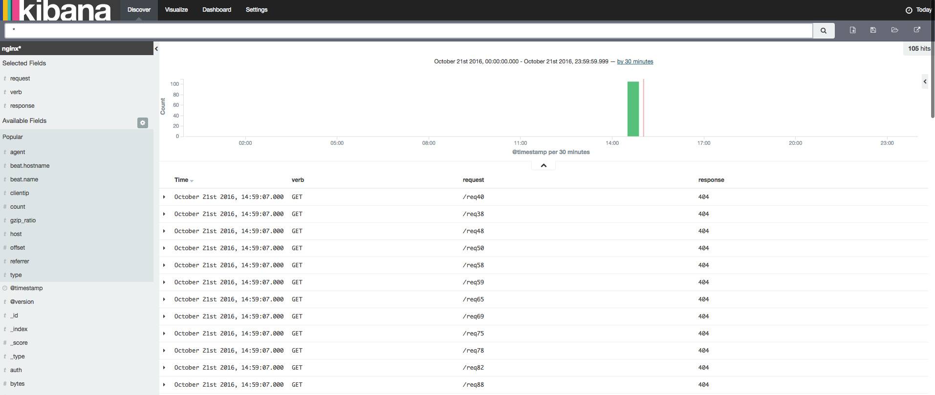 接下来我们需要产生点日志,然后在 Kibana 中能查看到就说明系统工作正常了。我们用 curl 随便请求一下 client 上的 Nginx 来产生一点日志。然后,打开 Kibana,http://[server ip]:5601。刚进去的时候,我们先要配置一下 Kibana 的 Index Pattern,告诉 Kibana 我们想看哪个 Index 的数据,输入 nginx* 即可,然后点击 Discover 浏览数据。