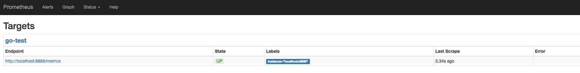 启动 Prometheus prometheus -config.file config.yml 以后,再启动我们的测试程序 go run test.go。打开 Prometheus 控制台 localhost:9090/targets 就可以看到 Prometheus 正在抓取数据,一切正常。