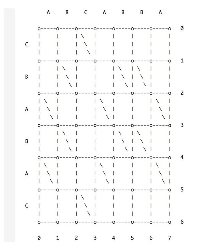 什么意思呢?还是以两个字符串,src=ABCABBA,dst=CBABAC 为例,根据这两个字符串我们可以构造下面一张图,横轴是 src 内容,纵轴是 dst 内容。