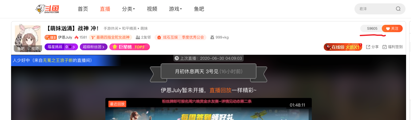 打开任何一个斗鱼主播的直播间,例如 这个主播,他的关注人数数据显示在右上角: