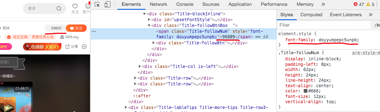 斗鱼在关注数据这里使用了字体反爬。什么是字体反爬?也就是通过自定义字体来自定义字符与渲染图形的映射。比如,字符 1 实际渲染的是 9,那么如果 HTML 中的数字是 111,实际显示就是 999。