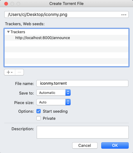 接下来尝试 qBittorrent,可以在 Mac 10.15 上运行。打开以后,选择新建种子,随便选择一个文件,然后 Tracker 填写上面的地址。